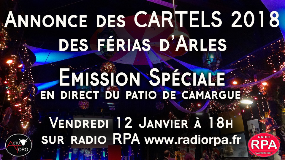 Le programme des Férias Arlésiennes sera annoncé le Vendredi 12 Janvier 2017 au Patio, Chez Chico. A cette occasion Radio RPA partenaire officiel des Arènes d'Arles se mobilise pour vous faire vivre cet événement en direct lors d'une émission spéciale à partir de 18h.